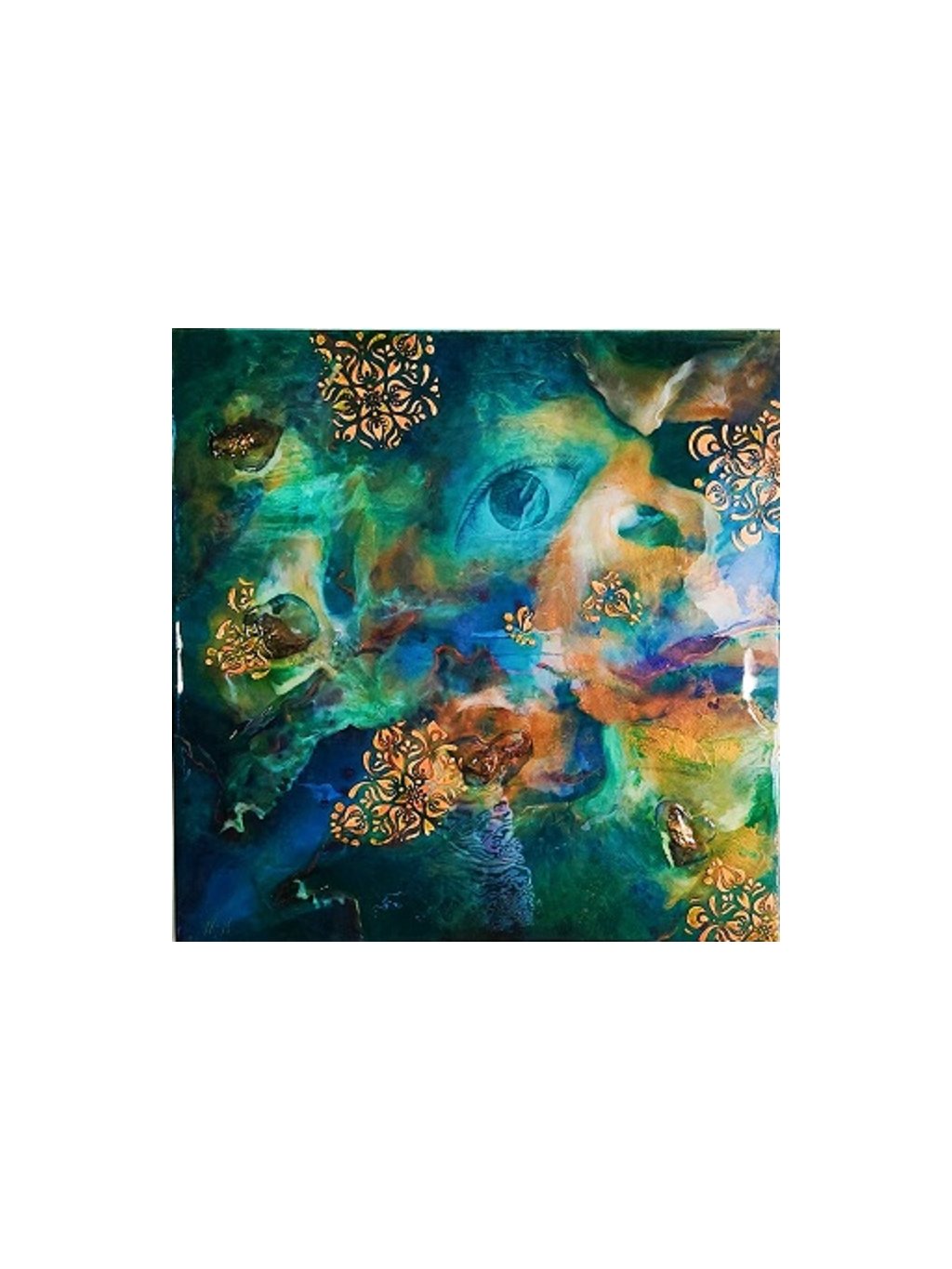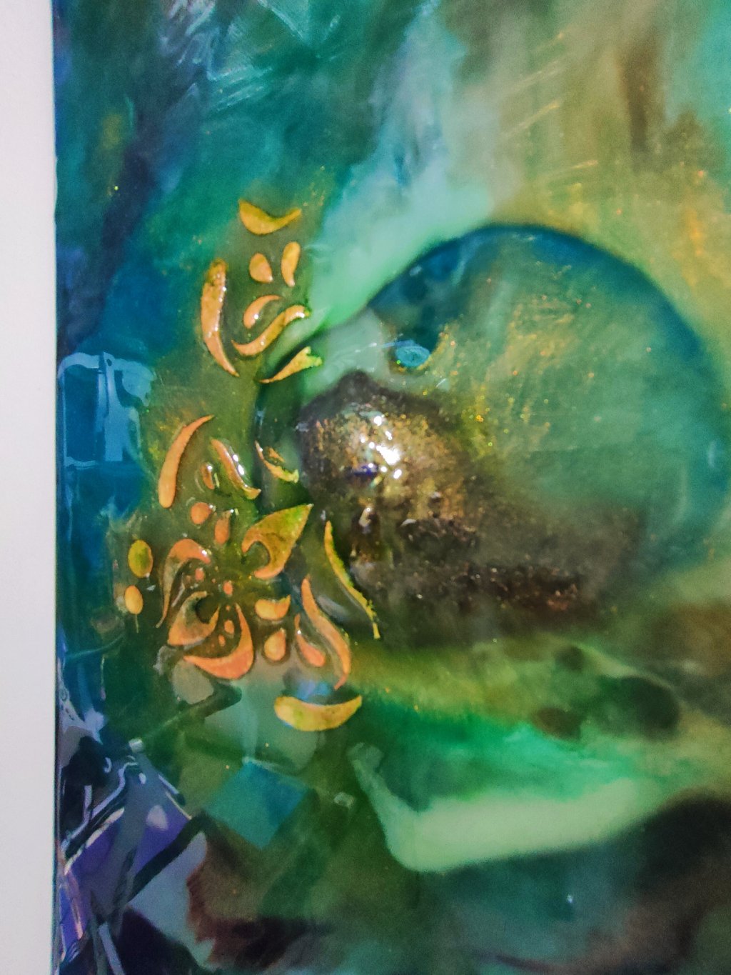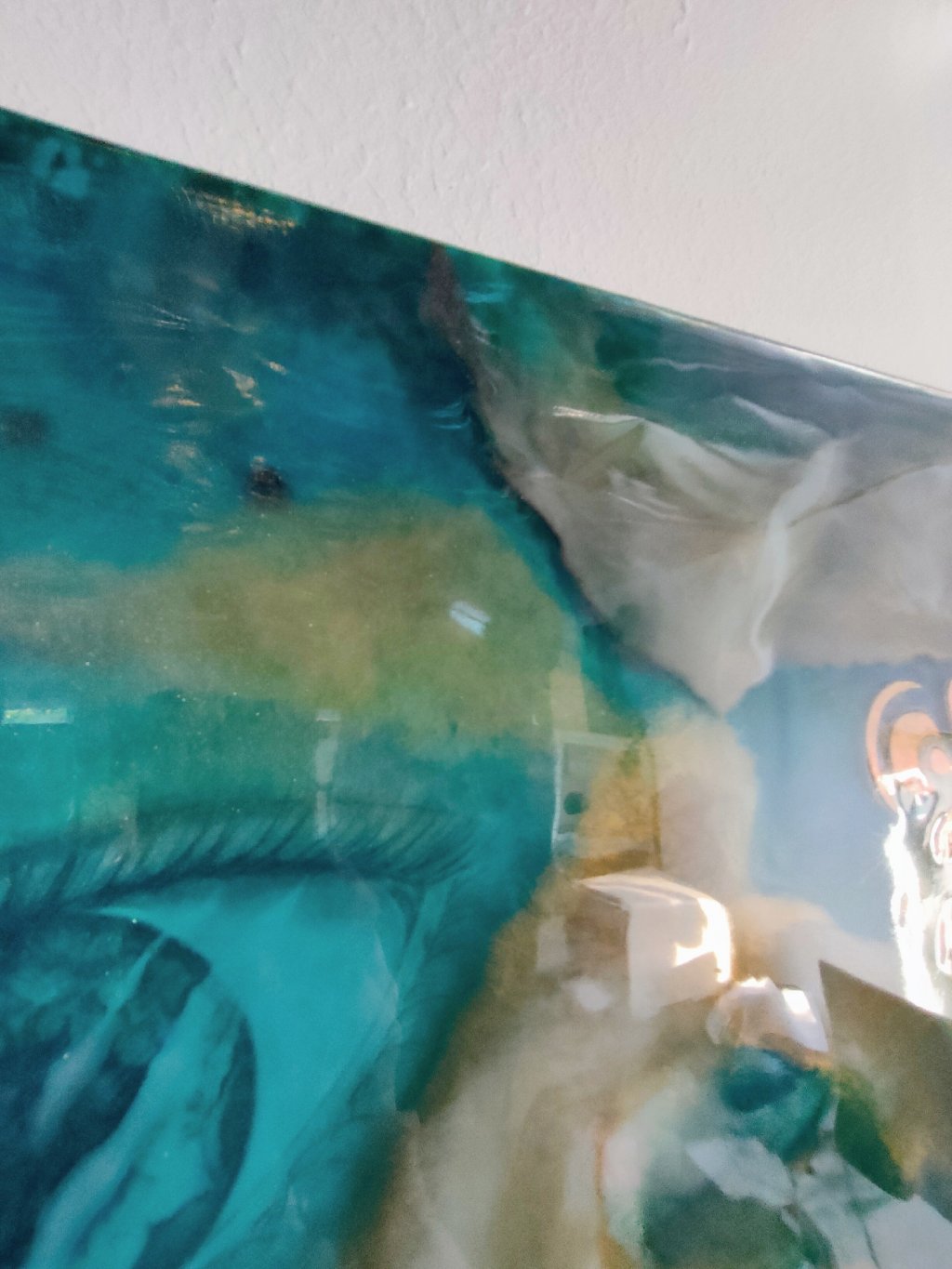 Obraz je probarvený pigmenty, tvořený v intervalech v několika vrstvách. Je UV stabilní a ve vysokém lesku. Ve skutečnosti barvy jdou postupně do hloubky. Na čtyřech místech zalité železné špony (vlastnosti orgonitu), zdobeny kameny - malachit, tygří oko a křišťál.