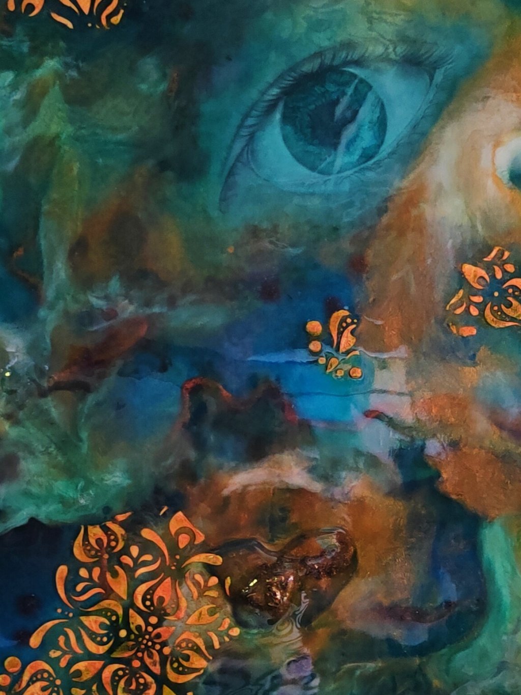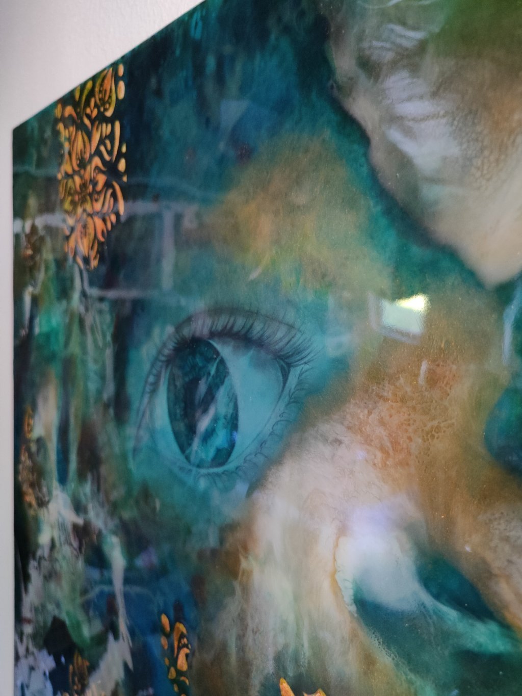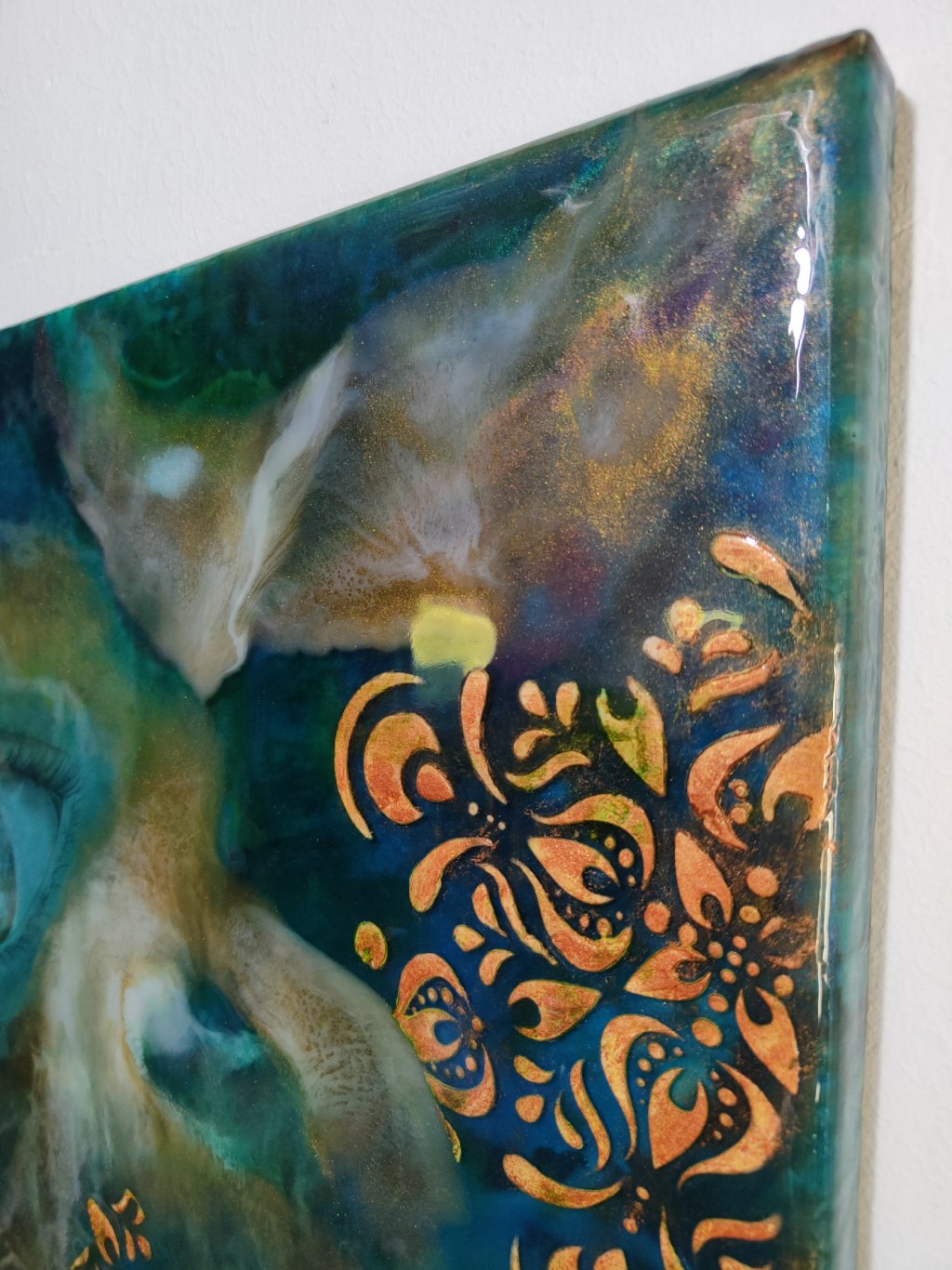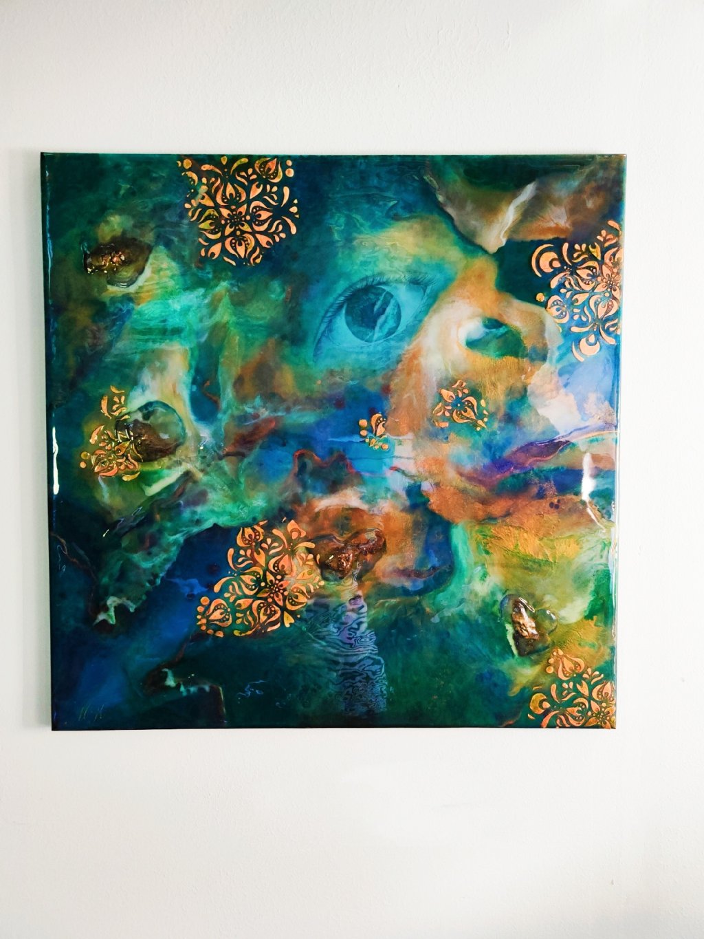 Obraz je probarvený pigmenty, tvořený v intervalech v několika vrstvách. Je UV stabilní a ve vysokém lesku. Ve skutečnosti barvy jdou postupně do hloubky. Na čtyřech místech zalité železné špony (vlastnosti orgonitu), zdobeny kameny - malachit, tygří oko a křišťál.